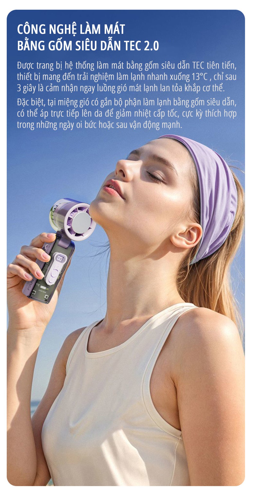 - Cảm Giác Mát Lạnh Tức Thì: Công nghệ làm mát bằng băng lạnh giúp bạn nhanh chóng cảm nhận được hơi mát, giải tỏa cơn nóng ngay lập tức.