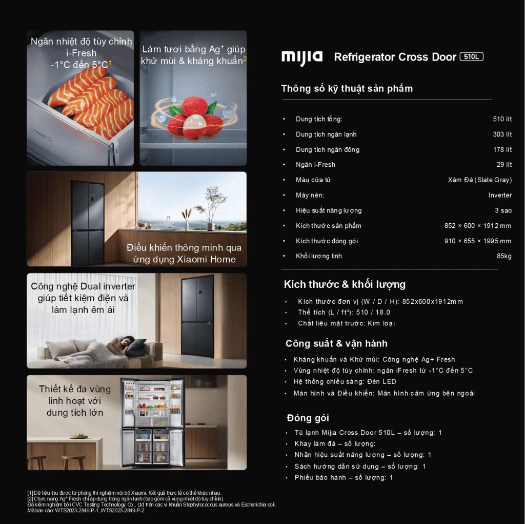 Tủ lạnh Mijia Refrigerator Cross Door 510L có kích thước 852 x 600 x 1912 mm, mang lại dung tích tổng là 510 lít, bao gồm ngăn lạnh 303 lít, ngăn đông 178 lít và ngăn i-Fresh 29 lít. Điều này cho phép người dùng dễ dàng sắp xếp thực phẩm và đồ uống mà không lo bị chật chội.